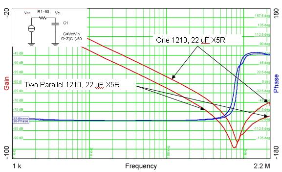 此外,還有一個與旁路電容有關(guān)的串聯(lián)電感,如圖 1 所示。頂部的曲線是貼裝在四層電路板上的一個22 uF、X5R、16V、1210 陶瓷電容的阻抗。正如我們所期望的那樣(100 kHz 以下),阻抗隨著頻率的增加而下降。然而,在800 kHz時有一個串聯(lián)電感,此時電容會變得有電感性。該電感(其可以從電容值和諧振頻率計算得出)為 1.7 nH,其大大高于我們 0.3 nH 的目標(biāo)值。幸運的是,您可以使用并聯(lián)電容以降低有效的 ESL。圖 1 底部的曲線為兩個并聯(lián)電容的阻抗。有趣的是諧振變得稍微低了一些,這表明有效電感并不是絕對的一半?;谥C振頻率,就兩個并聯(lián)的電容而言,新電感則為 1.0 nH 或ESL 下降 40%,而非下降 50%。這一結(jié)果可以歸結(jié)為兩個原因:互連電感和兩個電容之間的互感。