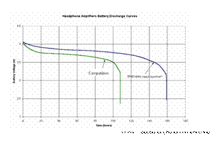 下圖的 Y 軸表示電池電壓,X 軸表示時(shí)間。綠線表示一般的接地置中耳機(jī)放大器,藍(lán)線表示 G 類耳機(jī)放大器。