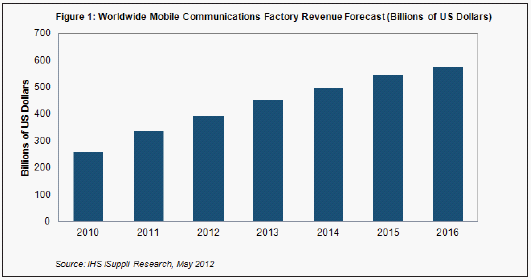 上述預(yù)測數(shù)據(jù)由無線通信產(chǎn)業(yè)各領(lǐng)域中的OEM廠商的總體工廠營業(yè)收入構(gòu)成,包括手機(jī)、媒體平板和移動(dòng)基礎(chǔ)設(shè)備等主要領(lǐng)域,以及無線路由器、無繩電話、電池充電器和灰市手機(jī)等輔助領(lǐng)域。