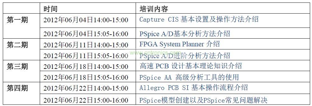 課程分為四期,內(nèi)容包括Capture CIS、PSpice、FPGA System Planner 以及Allegro PCB SI 培訓。