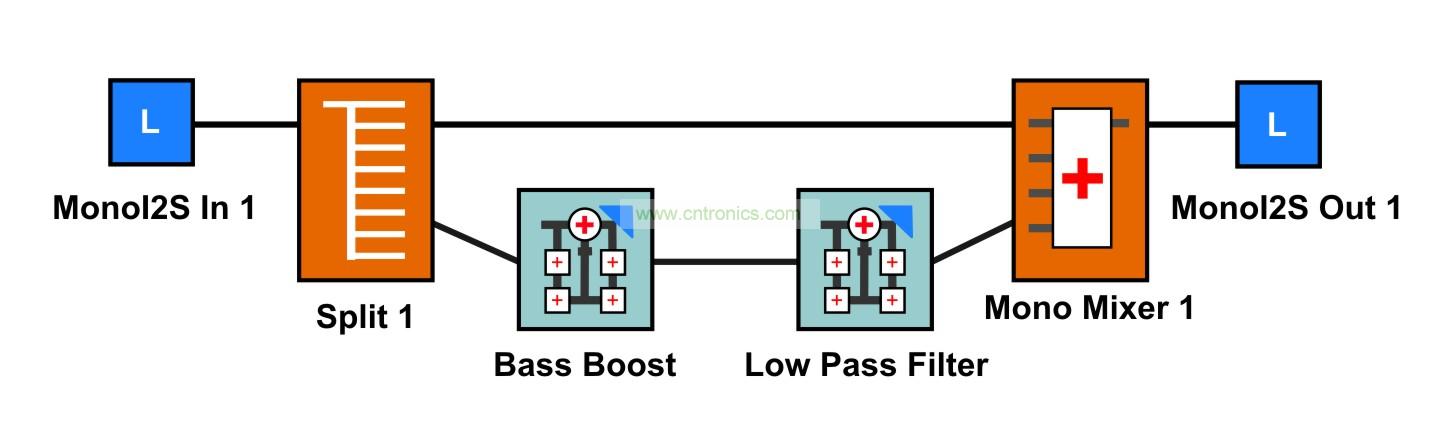 如果增頻頻率大體上較低,則請嘗試在增益級后面增加一個低通濾波器,以降低限幅引起的高頻。在模擬系統(tǒng)中,使用足夠高的截頻速率來構(gòu)建這種低通濾波器通常要求有一個多階濾波器,從而讓系統(tǒng)變得體積龐大且成本高昂。但是,在數(shù)字處理系統(tǒng)中卻可以輕松實現(xiàn),條件是在音頻處理器中有足夠的有效MIPS。圖2 顯示了軟限幅時一個處理流程的例子。