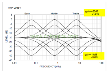為了實現(xiàn)音效處理,有必要了解一下音頻DSP均衡器(EQ) 的作用。均衡器具有增益及濾波的電路,增益電路對聲音進(jìn)行提升(Boost) 與削弱(Cut) ;濾波電路可以調(diào)節(jié)到需要的頻率響應(yīng)。普通模擬音效處理IC一般可以提供2頻帶(Bass/Treble) 或者3頻帶(Bass/Middle/Treble),而數(shù)字音效處理IC可以提供多個頻帶,比如7頻帶,甚至更多。圖5是3頻帶EQ的曲線。