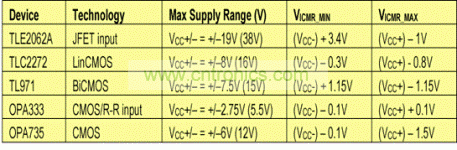 值得一提的一種寬輸入范圍特例是“軌到軌輸入運算放大器”。盡管,顧名思義,它是一種輸入涵蓋整個電源軌范圍的運算放大器,但并非所有軌到軌輸入器件都如許多人設(shè)想的那樣涵蓋整個電源范圍。許多軌到軌輸入運算放大器的確涵蓋了整個電源范圍(例如:表1中的OPA333等),但有一些則沒有全覆蓋,而其描述對人具有一定的誤導(dǎo)性。另外,檢查產(chǎn)品說明書中的規(guī)定輸入范圍至關(guān)重要。