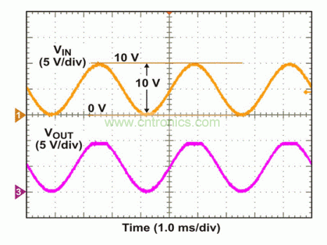 為了測試該電路,我們將VCC/2 = 5V DC偏移的300 Hz正弦波應(yīng)用于輸入端。在VOUT出現(xiàn)變化以前,一直對AC幅值進行調(diào)節(jié)。如圖4所示,當應(yīng)用10 Vp-p輸入時,VOUT在正軌附近出現(xiàn)一個經(jīng)削波的信號,而非負軌附近。如果輸入超出VCC – 0.8V(本例中為9.2V),這種正軌附近出現(xiàn)的非理想行為是我們能夠預(yù)計到的。9.2V以下VIN電平和低至0V時,VOUT顯示出正確的波形,正如我們所預(yù)期的那樣。