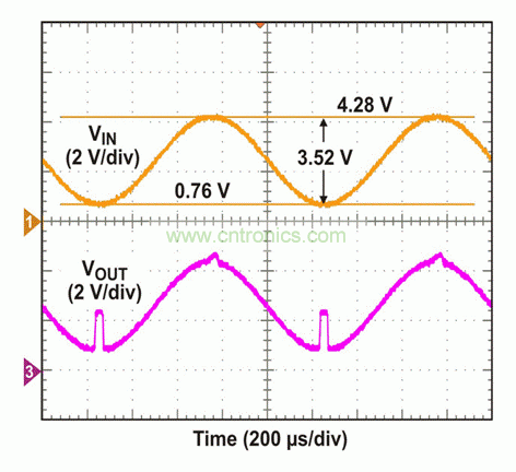 VIN稍稍增加至3.52 Vp-p,VOUT便開始在正(5V)和負(0V)軌附近呈現(xiàn)非線性行為(圖5)。VIN進一步增加至4.2 Vp-p,明顯超出VICMR。由于輸入峰值在正軌附近超出限制,因此其上跳至正軌(5V),并在VIN返回到某個可接受范圍以前一直保持在該狀態(tài),最終VOUT信號出軌(圖6)。隨著輸入降至負軌附近限制以下,VOUT信號表現(xiàn)出倒相,同時其跳至中軌(2.5V),并在VIN增加到VICMR范圍內(nèi)某個可接受電壓水平以前,一直通過偏壓來跟隨VIN。