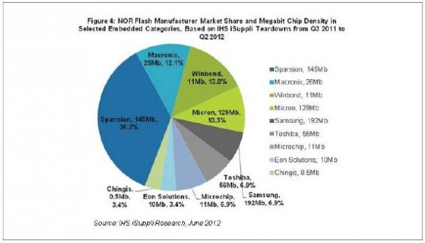 根據(jù)IHS iSuppli公司在三個季度內(nèi)拆解分析的55個嵌入產(chǎn)品,這些產(chǎn)品中有三分之一以上的NOR芯片屬于美國Spansion Inc.,在所有供應商中處于領先地位,如圖所示。Spansion,以及韓國三星電子和美國美光,提供的NOR芯片平均密度為數(shù)百Mb。從2011年第三季度到今年第二季度,這三家公司占上述三個子領域中NOR芯片的53.4%。剩下的46.6%市場份額屬于生產(chǎn)100Mb以下密度NOR閃存的廠商。這類廠商包括臺灣旺宏電子和華邦電子等大型廠商,以及臺灣常憶科技和宜揚科技等規(guī)模較小的廠商。