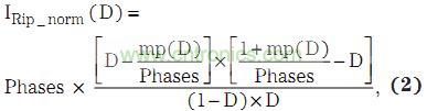 其中,D 為占空比,IRip_norm 為標(biāo)準(zhǔn)化的紋波電流,其為D 的函數(shù),而mp 為m 的整數(shù)。圖3 為這些方程式的曲線圖。例如,20% 占空比(D) 時使用2 個相,可降低25% 紋波電流。電容器必須承受的紋波電壓大小,可通過紋波電流乘以電容器的等效串聯(lián)電阻計算得到。很明顯,最大電流和電壓要求都降低了。