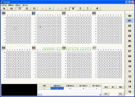 在此界面中,可以同時(shí)觀測(cè)到16*32個(gè)通道的LED照明或背光產(chǎn)品的老化??偣卜譃?6組, 每組可達(dá)32個(gè)通道, 并用數(shù)組表示。界面上每個(gè)方塊代表一個(gè)通道,當(dāng)該通道配置時(shí),該通道方塊呈灰色。用顏色來區(qū)分不同的運(yùn)行狀態(tài),能使用戶在使用過程中更加清晰、簡(jiǎn)便、快速的觀測(cè)到任何細(xì)微的變化。通常來說,為了符合人們的習(xí)慣,不同顏色所表示的功能如下: