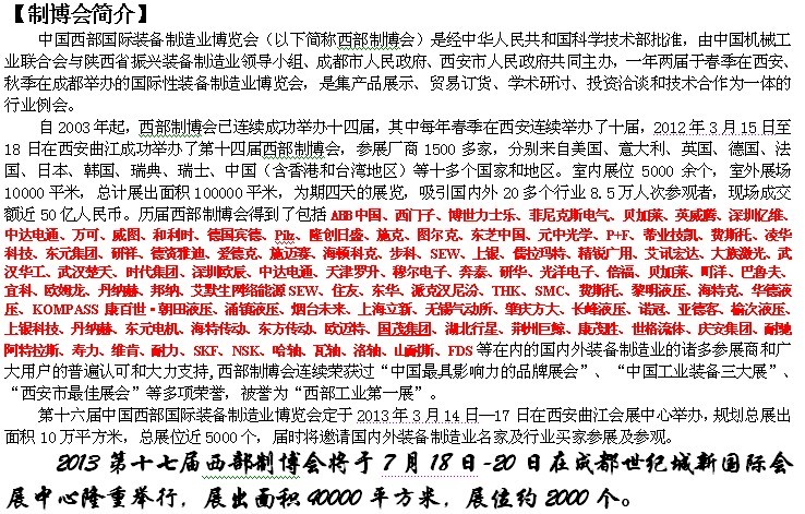 地 點(diǎn): 西安曲江國(guó)際會(huì)展中心 時(shí) 間:第16屆2013年3月14-17日