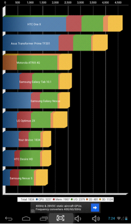 具有600MHz主頻SGX PVR540 GPU的RK3168在此項測試上遠(yuǎn)遠(yuǎn)拋離A20的Mail 400 @350Mhz,充分體現(xiàn)了兩者在GPU性能上的巨大差距。目前GPU性能對于平板來說是僅次于CPU的重要指標(biāo),很大程度上決定了整機(jī)在運行大型游戲、播放在線視頻等方面的體驗,對消費者來說是非常重要的考慮因素。