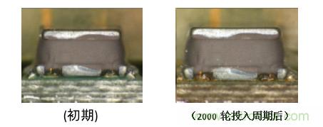 磁性樹(shù)脂和鼓芯都沒(méi)有看見(jiàn)裂紋產(chǎn)生。另外,電氣特征的變化也控制在±1%以?xún)?nèi)。-40℃⇔+105℃的環(huán)境下外觀上沒(méi)有任何的破壞,并且電氣特征保持穩(wěn)定,這使其成為了能夠滿(mǎn)足車(chē)載用電子元器件性能要求的產(chǎn)品。