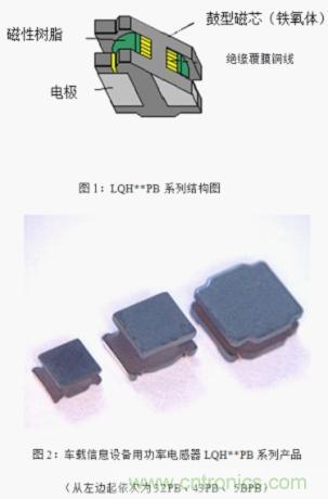 LQH**PB系列產(chǎn)品是在最高可達105℃的環(huán)境下使用的繞線型電感器,該系列在2012年5月被產(chǎn)品化至今已經(jīng)有2年的生產(chǎn)業(yè)績。LQH**PB系列的構造是在鼓型磁芯周圍纏繞絕緣覆膜銅線,以減少漏磁及保護絕緣覆膜銅線達到提高產(chǎn)品強度等目的,是一種涂有磁性樹脂類型的產(chǎn)品。其結(jié)構圖如圖1,產(chǎn)品照片如圖2。
