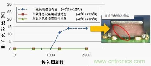 熱沖擊試驗投入的循環(huán)數(shù)和開裂發(fā)生率的關系如圖3所示??梢缘弥?,與面向一般民用市場的磁性樹脂在1000次循環(huán)試驗以內(nèi)會發(fā)生開裂相比,我們開發(fā)出的用于車載信息設備的磁性樹脂在2000次循環(huán)之后仍未發(fā)生開裂現(xiàn)象。并且,已經(jīng)確認在更為嚴酷的環(huán)境下---40℃↔+125℃中進行的熱沖擊試驗也沒有發(fā)生開裂現(xiàn)象。