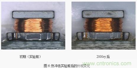圖6、7所示為關于LQH43NN222K03在-40℃↔+105℃/2000循環(huán)熱沖擊試驗前后的外觀照片,主要電氣特性的變化。在熱沖擊試驗后,沒有發(fā)現(xiàn)鼓形磁芯的開裂及電線斷線等不合格現(xiàn)象。另外,關于主要的電氣特性,變化率也控制在±1%以內(nèi),是滿足了車載用元器件性能要求的產(chǎn)品。