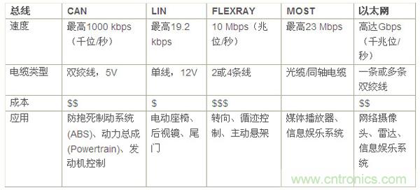一輛典型的現(xiàn)代化汽車將同時(shí)裝配各類總線和協(xié)議并從 LIN、CAN、FlexRay、MOST 和以太網(wǎng)中選擇合適的網(wǎng)絡(luò)。多媒體/視聽信號(hào)和汽車環(huán)繞攝像系統(tǒng)需要更高的數(shù)據(jù)速率,因此汽車制造商和 OEM 廠商在網(wǎng)絡(luò)解決方案上選擇用以太網(wǎng)代替 MOST。但對(duì)于許多標(biāo)準(zhǔn)汽車功能而言,LIN 和 CAN 提供的帶寬與性能就足夠了。