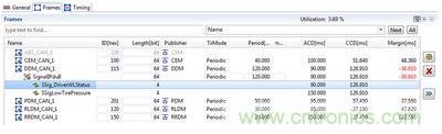 在模擬 CAN 總線數(shù)據(jù)路徑時(shí),需要考慮到傳輸開始時(shí)的不確定性。可能出現(xiàn)的情況是,更高優(yōu)先級(jí)的信息占用數(shù)據(jù)總線,從而造成傳輸延遲。因此要找出造成延遲變化的抖動(dòng)因素 -- 通常要提前知道有多少優(yōu)先級(jí)較高的信號(hào)可能在總線上,這樣可以盡可能精確預(yù)測(cè)抖動(dòng)因素。通過這些參數(shù)和進(jìn)行自動(dòng)化設(shè)計(jì)規(guī)則檢查 (DRC),從第(3)步到第(7)步的最大延遲為74.5毫秒,這樣的設(shè)計(jì)檢查可以通過。這是“最壞情況”的測(cè)試,設(shè)計(jì)人員要相信路徑延遲永遠(yuǎn)不會(huì)比這更糟,實(shí)際上會(huì)好很多。