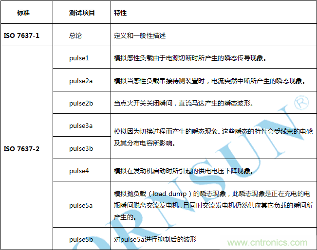 針對(duì)汽車電子自身產(chǎn)生的干擾,國(guó)際無(wú)線電干擾委員會(huì)(CISPR)對(duì)汽車電子業(yè)提出了嚴(yán)格的要求,尤其是車載收音機(jī)、數(shù)字電視、導(dǎo)航設(shè)備都是這種干擾的重災(zāi)區(qū)。所以 CISPR25:用于保護(hù)車載接收機(jī)的無(wú)線電騷擾特性的限值和測(cè)試方法,對(duì)汽車電子自身的發(fā)射狀態(tài)也有了明確的等級(jí)判定。EMS方面的測(cè)試項(xiàng)目如下所示:
