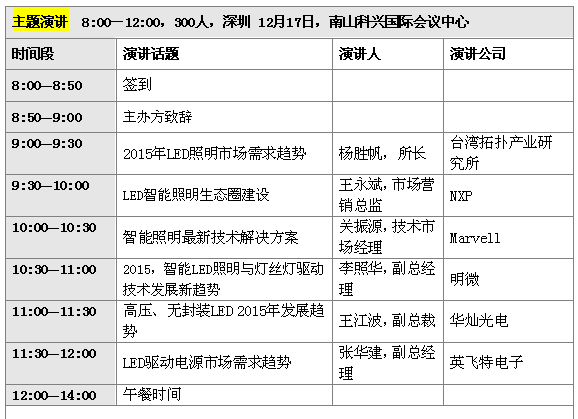 《第三屆華強(qiáng)國際LED照明前瞻技術(shù)研討會(huì)》將于2014年12月17日(周三)在廣東省深圳市科技園科興國際會(huì)議中心3樓舉行,屆時(shí)臺(tái)灣拓?fù)洚a(chǎn)業(yè)研究所所長楊勝帆、NXP市場營銷總監(jiān)王永斌、Marvell技術(shù)市場經(jīng)理關(guān)振源、明微電子副總經(jīng)理李照華、昂寶副總裁高維、昂帕董事長桑鈞晟博士、英飛特電子副總經(jīng)理張華建、華燦光電副總裁王江波、聚元微電子總經(jīng)理韓興成、綠寶石技術(shù)總監(jiān)伍松、中昊光電總經(jīng)理王孟源、華燦光電副總裁王江波、清華大學(xué)副研究員錢可元將親自前來與您共同探討2015年LED照明市場的新需求、新變化和新趨勢,精彩就在眼前,期待您也能撥冗前來共襄這一LED照明行業(yè)全明星盛會(huì)。