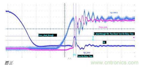 測試的目的是看上MOS管導(dǎo)通時(shí),有沒有同時(shí)把下管打開,從而導(dǎo)致電源直接導(dǎo)通到地而引起短路。如圖三所示藍(lán)色曲線(Vgs_Lmos)就是下管在上管導(dǎo)通的同時(shí),被帶了起來,如果藍(lán)色曲線的被帶起來的尖峰超過了MOS管的Vth要求,同時(shí)持續(xù)時(shí)間(Duration)也超過了datasheet要求,從而就會(huì)有同時(shí)導(dǎo)通的風(fēng)險(xiǎn)。當(dāng)然,這是大家最常見到的情況。