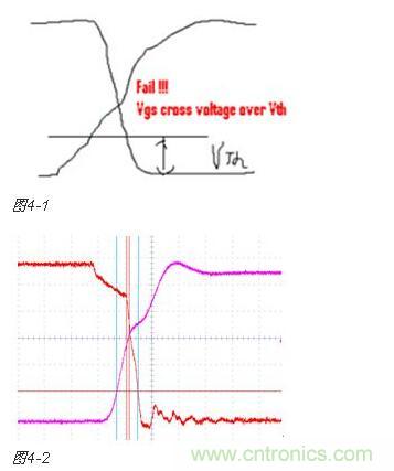 下面這種情況有非常多的人會(huì)忽視,甚至是一些比較有經(jīng)驗(yàn)的電源測試工程師。下面組圖四是下管打開,上管關(guān)閉時(shí)候的波形(圖4-1是示意圖,圖4-2示實(shí)際測試圖)。雖然沒有被同時(shí)帶起的情況,但是請注意上下管有交叉的現(xiàn)象,而且交叉點(diǎn)的電平遠(yuǎn)高于MOS管規(guī)定的Vth值,這是個(gè)嚴(yán)重的shoot through現(xiàn)象。最直接的后果就是MOS管燒毀!