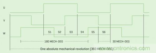 圖2b 換向編碼器產(chǎn)生的U、V和W波形