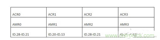 如上表所示,ACR寄存器是接收代碼寄存器,AMR是接收屏蔽寄存器。ACR一般是需要與對應的ID相吻合的,但是如果AMR的相應位上設置為1的時候,ID的那一位數(shù)據(jù)可以不和AMR的相應位一樣,也就是起到屏蔽的作用。