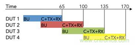 利用多線程并行軟件架構(gòu)和外部開關(guān)電路,已經(jīng)完成啟動的DUT在執(zhí)行TX和RX測試時,并行軟件線程可控驅(qū)動下一個DUT的啟動過程,從而實現(xiàn)測試的流水線執(zhí)行。這種方法減少了儀器的停機時間,縮短了高達35%的測試時間,如圖4所示。