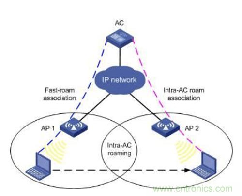 AC內(nèi)漫游(Intra-AC roaming):一個(gè)無線終端從AC的一個(gè)AP漫游到同一個(gè)AC內(nèi)的另一個(gè)AP中,即稱為AC內(nèi)漫游。如圖1所示。