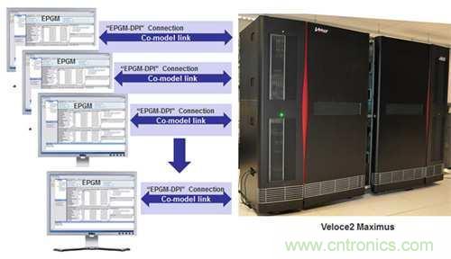 VirtuaLAB可為每個工作站提供32GMII、XGMII、XLGMII/CGMII和CXGMII埠。多個工作站的多個VirtuaLAB應(yīng)用可以結(jié)合在一起,即實(shí)現(xiàn)多個傳輸通道,可支援多埠數(shù)所需配置。采用高速鏈路(HSL)卡將各個工作站的協(xié)同模型(Co-model)連接到模擬器中。緊密集成的傳輸機(jī)制已準(zhǔn)備就緒,設(shè)計時鐘性能已調(diào)節(jié)至最佳化,并且它對測試平臺來說是透明的。由于采用并行運(yùn)行時和調(diào)試架構(gòu),資料流(Data-plane)硬體模擬流量會隨埠數(shù)呈線性增長。圖4為多個協(xié)同模型拓?fù)涞募軜?gòu)圖。