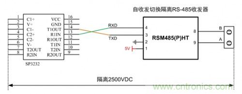 方案一用的是內(nèi)部支持自收發(fā)的RSM485PHT系列,UART端交叉連接即可。方案二用的是常規(guī)帶收發(fā)控制引腳的隔離485,需多用非門電路對收發(fā)進行控制。