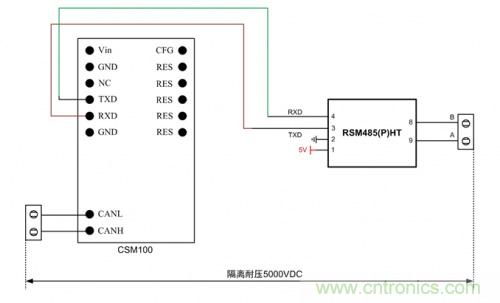 RS485和CAN雖然物理層都是差分傳輸,但因CAN多了更多的底層協(xié)議,兩者不能通過簡單的方式直接轉換。此時,使用如圖6所示的CSM100+RSM485模塊方式,利用CSM100能將CAN轉成UART數(shù)據(jù),再用RSM485PHT將UART轉成RS485電平,實現(xiàn)RS485轉CAN的功能。