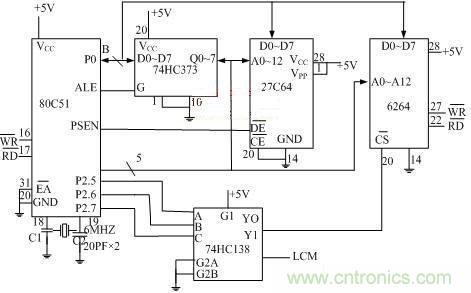 在壓力測量控制系統(tǒng)中,80C51擴(kuò)展8K的EPROM (27C64)和8K的SRAM (6264)作為外部的程序存貯器和數(shù)據(jù)存貯器。選擇了較低的6MHz作為80C51單片機(jī)的工作頻率,能滿足數(shù)據(jù)采集要求,同時還可以降低單片機(jī)的功耗,擴(kuò)展系統(tǒng)連接圖如圖3所示。