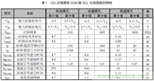 l總線電平:即輸入電壓Vcc,一般的I2C輸入電壓為3.30V,若為其他輸入電壓值也可通過(guò)旋鈕A對(duì)其進(jìn)行調(diào)節(jié)??偩€電平Vcc的調(diào)節(jié)將會(huì)影響VIL和VIH 的值,Vcc與VIL 、VIH存在如表2所示的關(guān)系。