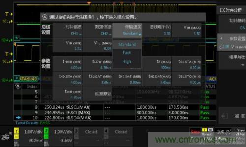 使用I2C時(shí)序分析軟件,它能夠在極短的時(shí)間內(nèi)完成總線信號(hào)的DC特性和AC特性分析,并與器件手冊(cè)標(biāo)稱參數(shù)做對(duì)比,直接輸出測(cè)試結(jié)果(Pass/Fail),同時(shí)支持報(bào)表導(dǎo)出,省去人工錄入數(shù)據(jù)的煩惱,極大的提升測(cè)試效率。具體測(cè)試界面如下圖4所示。