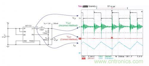 下圖描述了采用兩個(gè)不同的測(cè)試方法得到的Vout波形。電源電路是一個(gè)BUCK轉(zhuǎn)換電路(AAT1121),工作在1.5MHz的開關(guān)頻率,輸出電壓為1.8V/250mA。示波器采用全帶寬測(cè)試。可以看到伴隨著PWM開關(guān),在綠色的trace2有一個(gè)很高的噪音以及振鈴,但是trace3上卻沒有明顯的噪聲。通過對(duì)比可以看到,測(cè)試方法的選擇對(duì)結(jié)果的準(zhǔn)確性很關(guān)鍵。