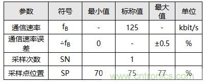 例如某著名車廠CAN通信標準里規(guī)定,通信速率為125 kbps時,應該采用單次采樣,采樣點位置設置在70%~77%之間。其位定時參數(shù)取值可見表1與表2。