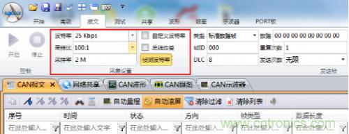 根據(jù)上面提到的原則,我們選取采樣點為75%,SJW為4,時間份額為14的一組參數(shù),采用ZLG的CAN卡做驗證。