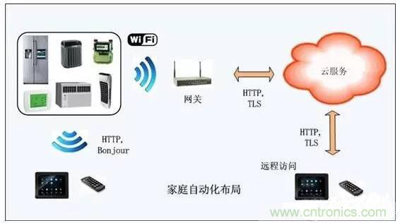 從上圖可看出,家庭自動化系統(tǒng)將嵌入式微控制器技術、無線連接、接入網絡融合為一體。Apps軟件能夠使用戶發(fā)現家里的設備,予以設置,或者創(chuàng)建一個動作加以控制。