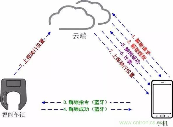 1.手機(jī)先掃單車上二維碼,而后向云端發(fā)起解鎖請求(請求中會攜帶掃碼單車的ID信息及用戶個人賬號信息)。云端對用戶信息、單車信息進(jìn)行核查,而后將授權(quán)信息發(fā)送給手機(jī)。(步驟1、2)