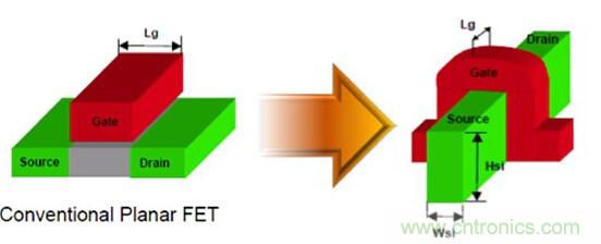 如前面所說,柵極越窄,即納米數(shù)越低,功耗和性能都有明顯收益。但是凡事都有兩面,有收益就會有代價。上圖左圖(即前面那張圖的結構)中的紅色柵極越窄,則柵極接觸下面的面積就越小。前面說了,綠色源漏(SD)兩極的通斷是靠柵極通電壓控制的,但是面積越小這個柵極的控制力越弱,這就會導致出現(xiàn)兩極之間的漏電越來越大。這個問題在20nm時達到了一個很大的值,對功耗影響很大。所以早在10年前,就有人提出了右圖中的3D晶體管的新結構。由于這個結構看上去像張開的魚鰭,所以被叫做FinFET技術。FinFET技術最主要的好處是紅色的柵極變成三面環(huán)繞綠色SD兩極之間的通道了,這樣柵極就又重新具備了對這個通道的強力控制力,原先通過減小柵極寬度的方法就可以繼續(xù)了。有人可能會有疑問,十年前就提出為什么現(xiàn)在才用,其實概念到實施不是那么容易的。大家腦補一下這個結構是在20nm的范圍里做的,導致工藝要多出十幾二十層來,這不僅是難度,也是成本。