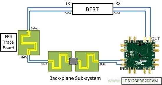 這一切聽起來很棒,但該工具能給您帶來可靠的結(jié)果嗎?為了回答這個問題,筆者去了實驗室,并進行了一些測量。筆者決定使用一個速率為12.5Gbps的Linear re-driver DS125BR820EVM、一些FR4印刷電路板(PCB)走線以及具有SMA連接器、適用于背板子系統(tǒng)的子卡。圖1展示了筆者的簡單設(shè)置。使用一個誤碼率測試器(BERT)作為為本次研究的發(fā)送器及接收器)。