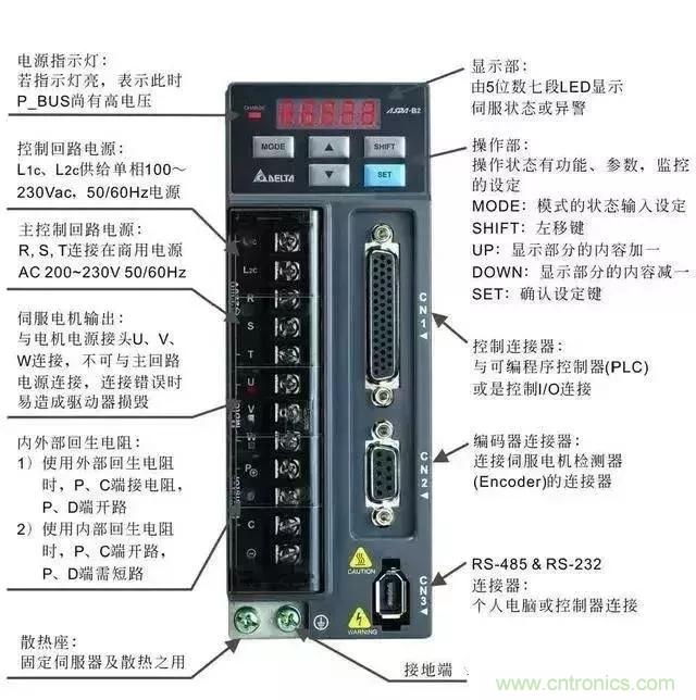 伺服驅(qū)動器主要有控制回路電源、主控制回路電源、伺服輸出電源、控制器輸入CN1、編碼器接口CN2、連接起CN3??刂苹芈冯娫词菃蜗郃C電源,輸入電源可單相、三相,但是必須是220v,就是說三相輸入時,咱們的三相電源必須經(jīng)過變壓器變壓才能接,對于功率較小的驅(qū)動器,可單相直接驅(qū)動,單相接法必須接R、S端子。伺服電機(jī)輸出U、V、W切記千萬不能與主電路電源連接,有可能燒毀驅(qū)動器。CN1端口主要用于上位機(jī)控制器的連接,提供輸入、輸出、編碼器ABZ三相輸出、各種監(jiān)控信號的模擬量輸出。