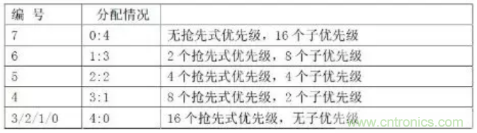 兩種優(yōu)先級(jí)由4位二進(jìn)制位決定。分配下來有十六種情況: