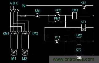 各個引腳的含義我們已經(jīng)搞清楚了,下面就可以根據(jù)控制原因進行接線,我們以下圖為例,在電路中加入KT通電延時時間繼電器,當按下啟動按鈕SB2線圈KT1、KM1得電交流接觸器KM1吸合,電動機M1轉動,延時閉合開關KT1到達時間吸合,KM2、KT2得電,交流接觸器KM2得電吸合,電動機M2轉動,延時斷開開關KT2在到達時間以后斷開,整個控制回路斷開,所有電機停止轉動;