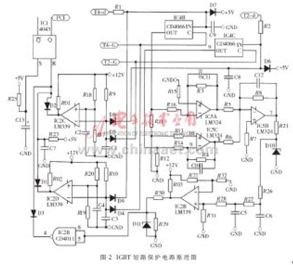 由對(duì)圖1所示電路的分析,可以得到IGBT短路保護(hù)電路的原理電路圖,如圖2所示。在圖2所示電路中, IC4及其外圍器件構(gòu)成選通邏輯電路,由IC5及其外圍器件構(gòu)成濾波及放大電路,IC2及其外圍器件構(gòu)成門(mén)限比較電路,IC1及其外圍器件構(gòu)成保持電路。正常情況下,D1、D2、D3的陰極所連接的IC2D、IC2C及CD4011的輸出均為高電平,IC1的輸出狀態(tài)不會(huì)改變。假設(shè)由于某種原因,在給T2發(fā)驅(qū)動(dòng)信號(hào)的時(shí)候,H型橋式PWM變換電路的左半橋下管T2的管壓降異常升高(設(shè)電平值為“高”),即T2-d端電壓異常升高,則該高電平UT2-d通過(guò)R2加在D8的陰極;同時(shí),發(fā)給T2的高電平驅(qū)動(dòng)信號(hào)也加在二極管D5的陰極。對(duì)IC2C來(lái)說(shuō),其反相輸入端為高電平,若該電平值大于同相輸入端的門(mén)檻電平值的話,則IC2C輸出為“低”。該“低”電平通過(guò)D2加在R-S觸發(fā)器IC1的R輸入端,使其輸出端Q的輸出電平翻轉(zhuǎn),向控制系統(tǒng)發(fā)出IGBT故障報(bào)警信號(hào)。如果是由于右半橋下管T4的管壓降異常升高而引起IC2D輸出為“低”,則該“低”電平通過(guò)D1加在R-S觸發(fā)器IC1的R輸入端,使其輸出端Q的輸出電平翻轉(zhuǎn),向控制系統(tǒng)發(fā)出IGBT故障報(bào)警信號(hào)。由IC5A和IC5C及其外圍器件構(gòu)成的濾波及放大電路將選通電路送來(lái)的描述IGBT管壓降的電壓信號(hào)進(jìn)行預(yù)處理后,送給由IC5B構(gòu)成的加法器進(jìn)行運(yùn)算處理。若加法器的輸出電平大于由R22和R32確定的門(mén)檻電平,則會(huì)使R-S觸發(fā)器IC1的R端的第三個(gè)輸入端為“低”,也向控制系統(tǒng)發(fā)出IGBT故障報(bào)警信號(hào)。改變由R22和R32確定的門(mén)檻電平,就可以靈活地改變這第三路報(bào)警信號(hào)所代表的物理意義,從而靈活地設(shè)計(jì)保護(hù)電路。圖2中的端子T4-d、T2-d,分別接在T4、T2的集電極上,T4-G、T2-G分別接IGBT器件T4、T2的驅(qū)動(dòng)信號(hào)。在電路設(shè)計(jì)時(shí)應(yīng)該特別注意的是,D8、D5、D9、D4必須采用快速恢復(fù)二極管。