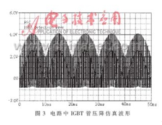 當(dāng)圖1所示的PWM變換器工作在單相高頻整流模式下,應(yīng)用PSPICE仿真軟件對(duì)圖2所示的電路進(jìn)行仿真研究,可以得到如圖3所示的結(jié)果。圖3所示的仿真波形相當(dāng)于在圖2電路中IC5B的第7腳觀察到的信號(hào)波形。仿真結(jié)果表明,檢測(cè)電路可以快速、有效地將PWM變換器的下管導(dǎo)通時(shí)的管壓降檢測(cè)出來(lái)。圖4所示波形是實(shí)際電路工作時(shí)檢測(cè)到的相關(guān)波形。圖中,1#通道顯示的是單相高頻整流電感電流的給定波形,2#通道顯示的是實(shí)際檢測(cè)到的圖2電路中IC5B的第7腳的工作波形。比較圖3和圖4可以得出,該檢測(cè)電路可以快速、有效地檢測(cè)出IGBT導(dǎo)通時(shí)的管壓降,從而對(duì)IGBT實(shí)施有效的保護(hù)。