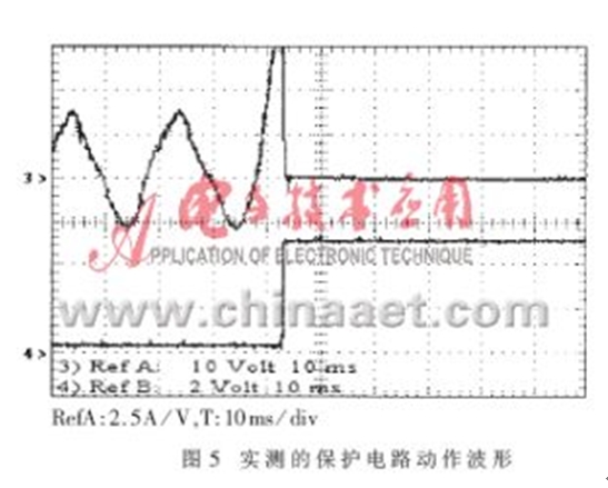 圖5所示為IGBT過(guò)流時(shí)實(shí)際檢測(cè)到的PFC電感中流過(guò)的電流及保護(hù)電路動(dòng)作的波形。