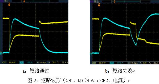 當(dāng)控制器工作時(shí),如電機(jī)短路,則會(huì)形成如圖1中所示的流經(jīng)Q2,Q3的短路電流,其電流值很大,達(dá)幾百安培,MOSFET的瞬態(tài)溫升很大,這種情況下應(yīng)及時(shí)保護(hù),否則會(huì)使MOSFET結(jié)點(diǎn)溫度過(guò)高而使MOSFET損壞。短路時(shí)Q3電壓和電流波形如圖2所示。圖2a中的MOSFET能承受45us的大電流短路,而圖2b中的MOSFET不能承受45us的大電流短路,當(dāng)脈沖45us關(guān)斷后,Vds回升,由于溫度過(guò)高,僅經(jīng)過(guò)10us的時(shí)間MOSFET便短路,Vds迅速下降,短路電流迅速上升。由圖2我們可以看出短路時(shí)峰值電流達(dá)500A,這是由于短路時(shí)MOSFET直接將電源正負(fù)極短路,回路阻抗是導(dǎo)線,PCB走線及MOSFET的Rds(on)之和,其數(shù)值很小,一般為幾十毫歐至幾百毫歐。