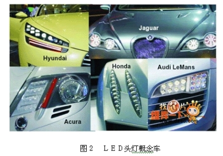 從LED的應(yīng)用歷史來看,早在1992年時已經(jīng)有LED應(yīng)用于第三剎車燈上的先例;而在2000年時則進一步的應(yīng)用于尾燈、轉(zhuǎn)向燈與剎車燈;到了2002年Audi A8率先將LED光源置于前置燈具內(nèi)作為日行燈,開啟了設(shè)計師與工程師們在前置燈具的想象空間。在之后的許多國際車展上都可以看到LED作為前照燈源的概念車,如圖2所示。