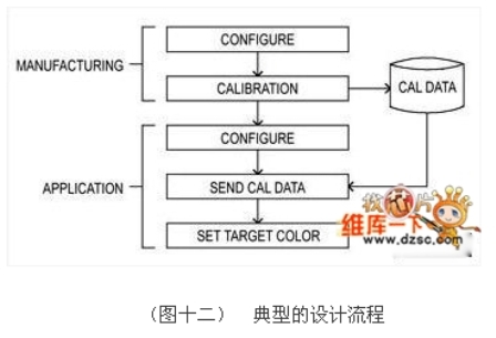 在生產(chǎn)階段,系統(tǒng)可以透過(guò)使用標(biāo)準(zhǔn)的CIE相機(jī)進(jìn)行調(diào)校,調(diào)校資料必須儲(chǔ)存在一個(gè)外部的短暫的記憶體中,而系統(tǒng)在導(dǎo)入到應(yīng)用后并不需要進(jìn)行調(diào)校程序。在應(yīng)用上,使用者首先對(duì)設(shè)備進(jìn)行組態(tài),接著將先前儲(chǔ)存的調(diào)校資料寫(xiě)入調(diào)校暫存器,這是一個(gè)簡(jiǎn)單的讀出然后寫(xiě)入的程序,完成后,系統(tǒng)就可以接受目標(biāo)色的輸入。